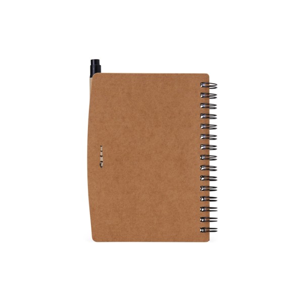 Bloco de anotações ecológico com caneta de papelão. Possui detalhe “smile” na...