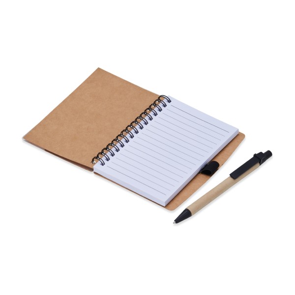 Bloco de anotações ecológico com caneta de papelão. Possui detalhe “smile” na...