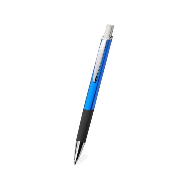 Caneta metálica com acionamento por rotação e carga esferográfica azul 1mm.