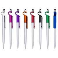 Caneta plástica com touch e suporte para celular. Corpo prata com detalhe col...