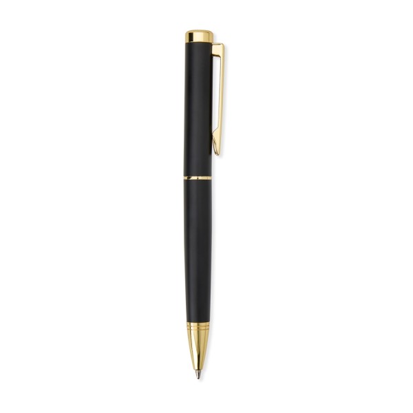 Caneta metálica com acionamento por rotação e carga esferográfica azul 1mm.