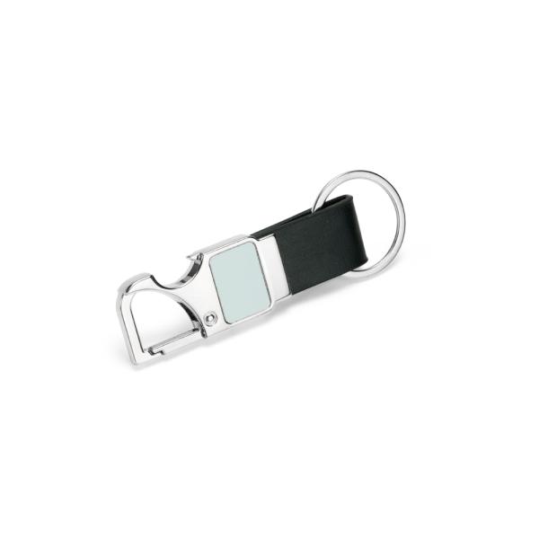 Chaveiro de metal quadrado com alça de couro sintético. Frente lisa e verso c...